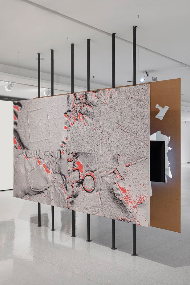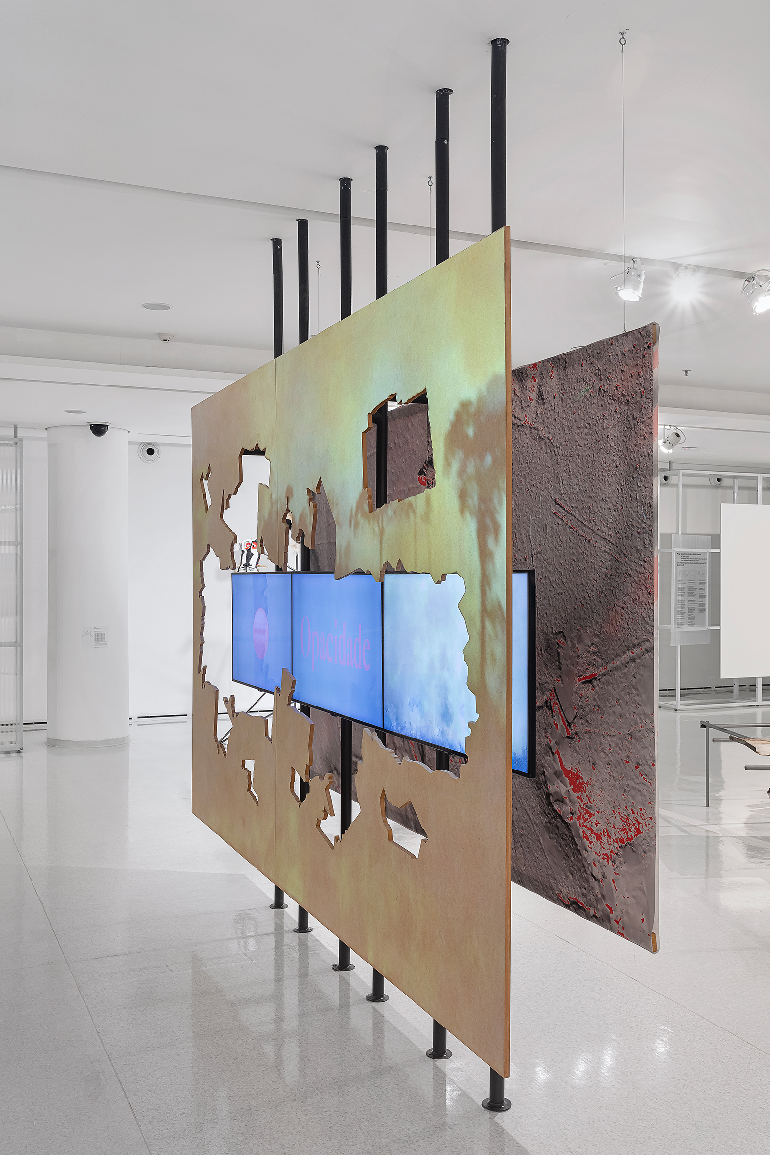 In it, the screens are arranged irregularly and juxtaposed by a laser-cut wooden panel, shaped to evoke fragmentation—sharp and chaotic. The brutality of deforestation, the intensity of heat, the destructive dynamics of the economy, and the haunting chaos surrounding this phenomenon all emerge. On the back of the panel, four images arranged like angled flags display newly discovered geoglyphs in the Amazon, juxtaposing temporalities and worldviews.