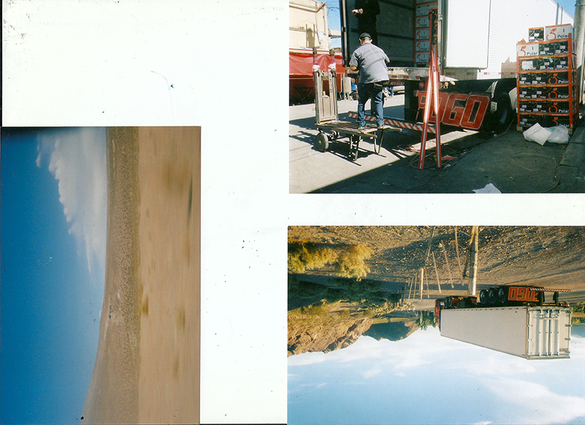 Road miles, latex boards, enamel paint, wood, photographs made by the truck drivers and metal.